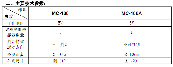 一、概述: MC-188/MC-188A脈沖板是利用反射式光電傳感器進(jìn)行采樣,經(jīng)整形后輸出矩形脈沖信號。采用本公司開發(fā)的調(diào)制解調(diào)專用芯 片,抗干擾能力強(qiáng)。 安裝使用中須注意以下事項(xiàng): ·脈沖板的取樣面必須是平面,取樣面的取樣標(biāo)記與取樣面顏色對比要大,這樣保證光電傳感器采樣可靠。 ·安裝脈沖板時光電傳感器的前端面與取樣面必須平行,距離保持在規(guī)定范圍內(nèi)。 ·脈沖板采樣光電傳感器避免強(qiáng)光照射,強(qiáng)光中的紅外線將影響光電傳感器的正常工作。