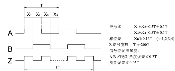 該編碼器由一個中心有軸的金屬光柵碼盤,2只專用碼盤傳感器讀取,獲得3組信號組合成。A、B兩相相差90度,可通過比較A相在前還是B相在前,以判別編碼器的正轉(zhuǎn)與反轉(zhuǎn),另每轉(zhuǎn)輸出一個180度的Z相250線脈沖信號。